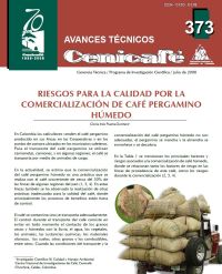 Riesgos para la calidad por la comercialización de café pergamino húmedo. En esta Avance Técnico se menciona los principales factores de riesgo asociados a la comercialización y al transporte del café pergamino húmedo, se relacionan tanto los factores de riesgo en las fincas de donde procede el café, como los riesgos durante la comercialización. Se debe evitar el contacto de los granos secos y húmedos con la lluvia, el agua, los vegetales, los animales, las sustancias químicas, los materiales olorosos, los suelos, otros granos y los combustibles. Cuando no se dan las condiciones adecuadas, el pergamino se mancha y la almendra se enmohece y se decolora.