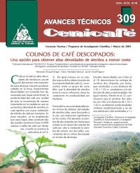 Colinos de café descopados: Una opción para obtener altas densidades de siembra a menor costo. En este avance técnico se muestra la conveniencia de establecer los cafetales con colinos descopados, lo cual permite obtener densidades de siembra altas, pero con menores costos en almácigos y en la instalación. Se tratan diferentes aspectos relacionados con el descope y se dan algunas recomendaciones para tener éxito con esta práctica.