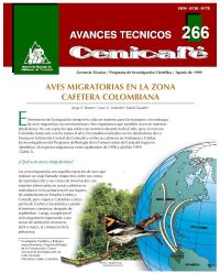 Aves migratorias en la zona cafetera colombiana. El Avance Técnico presenta información sobre aves migratorias registradas en fincas cafeteras de Caldas y Antioquia. Incluye datos de presencia, abundancia anual y proporción de especies migratorias, como parte de estudios de biodiversidad de Cenicafé. Además, explica el fenómeno migratorio y muestra fotografÃas de especies representativas, resaltando la importancia de los cafetales para la conservación de aves.