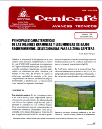 Principales características de las mejores gramíneas y leguminosas de bajos requerimientos, seleccionadas para la zona cafetera. En la zona cafetera colombiana se destacan brachiaria decumbens por su alta adaptación y productividad, y las leguminosas arachis pintoi, desmodium ovalifolium y leucaena leucocephala. Estas especies ofrecen cobertura del suelo, control de malezas, fijación de nitrógeno, producción forrajera, conservación del suelo y sostenibilidad del sistema cafetalero.
