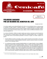 Perjuicios causados por residuos del beneficio del café. Los residuos del beneficio del café contaminan gravemente las aguas por su alta carga orgánica y acidez. Provocan muerte de fauna acuática, reducción de oxígeno, proliferación microbiana, malos olores, corrosión, turbidez y deterioro del paisaje. Ensayos en cenicafé demostraron que incluso bajas concentraciones de estas aguas causan rápida mortalidad en peces y renacuajos.