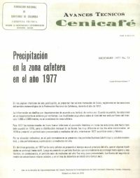 Precipitación en la zona cafetera en el año 1977. En 1977, la zona cafetera registró lluvias anuales inferiores al promedio histórico. El año inició con un período seco prolongado, seguido de lluvias anormalmente extendidas hasta septiembre. El verano de mitad de año fue poco pronunciado y las precipitaciones del segundo semestre se concentraron en octubre. En diciembre comenzó nuevamente un período seco en todo el país.