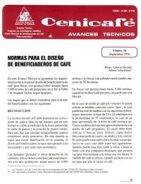 Normas para el diseño de beneficiaderos de café. Se establecen requisitos para diseñar beneficiaderos de café en fincas de hasta 5.000 arrobas anuales. La recolección debe hacerse cada quince días. Fincas pequeñas usan tolva de despulpadora manual; mayores requieren tolva de madera y segundo piso. La zaranda reduce agua. Un m³ de fermentación procesa 24 arrobas. Hasta 2.000 arrobas se seca al sol; producciones mayores usan secado artificial.