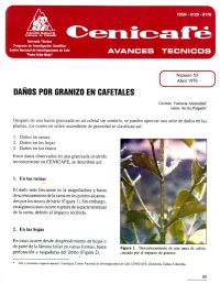 Daños por granizo en cafetales. Una granizada en cenicafé causó daños en café: magulladuras, descortezamiento y rupturas en ramas; desprendimiento, perforación y rasgaduras en hojas; y deterioro en frutos. Los granos jóvenes se ennegrecen y caen, los intermedios producen “grano negro” y los maduros solo presentan manchas. También se registró caída de frutos y yemas florales, afectando la producción y el desarrollo del cultivo.